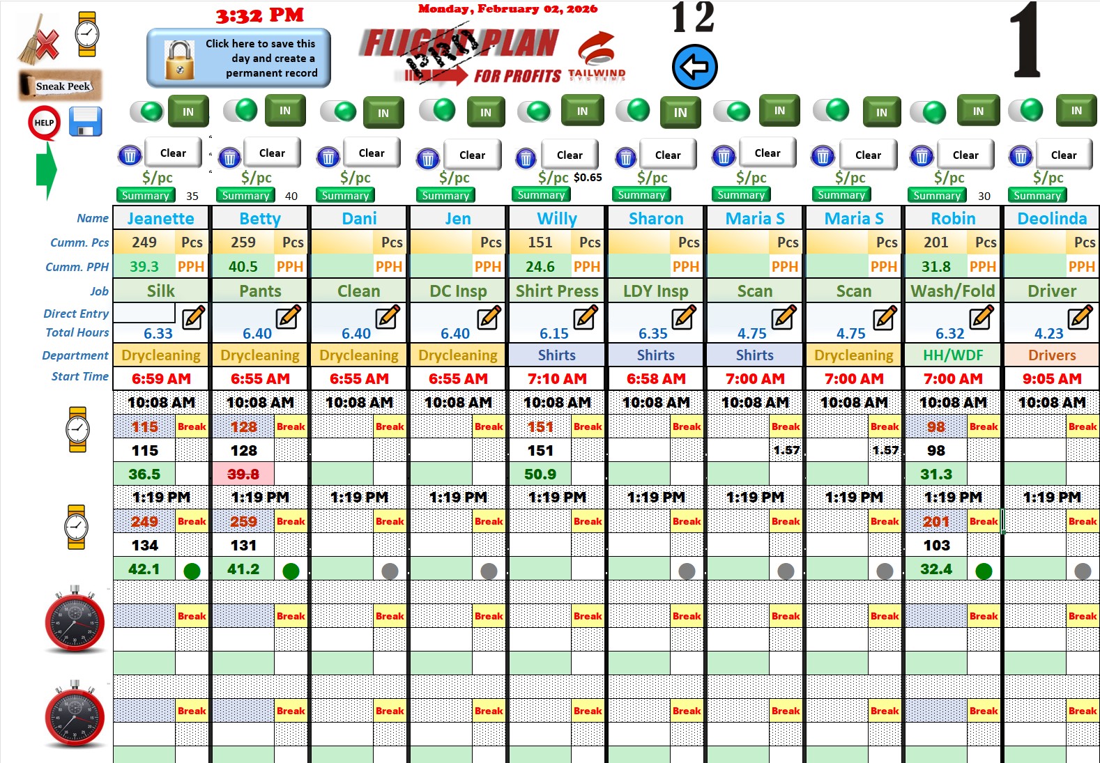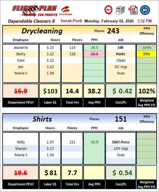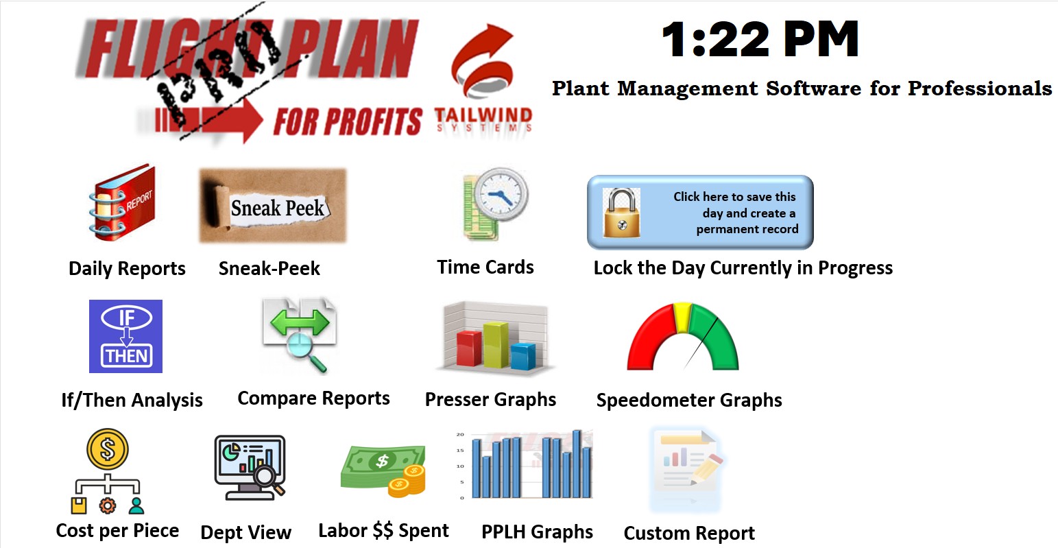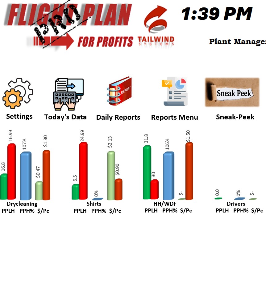 Developed by Tailwind Systems, Flight Plan for Profits PRO X is purpose-built plant management software for dry-cleaning operations. It captures real-time production data, calculates true cost-per-piece (including labor, overhead, and fixed costs), and turns raw numbers into clear, actionable reports.