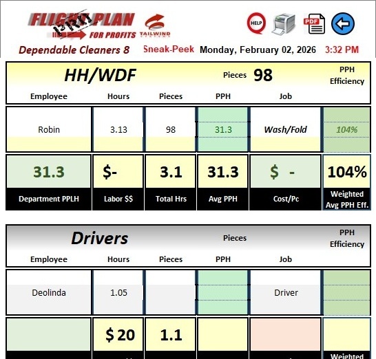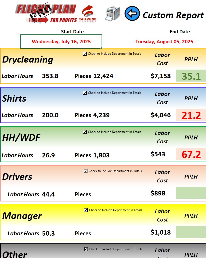 Developed by Tailwind Systems, Flight Plan for Profits PRO X is purpose-built plant management software for dry-cleaning operations. It captures real-time production data, calculates true cost-per-piece (including labor, overhead, and fixed costs), and turns raw numbers into clear, actionable reports.